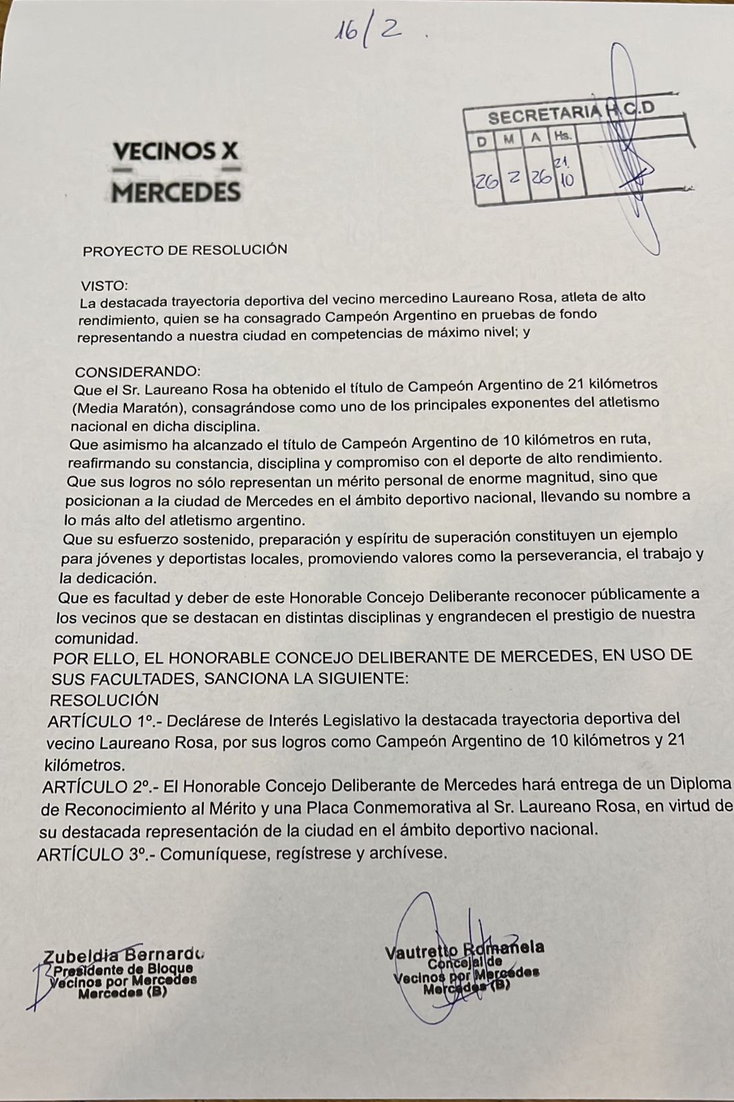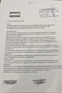 El bloque de concejales Vecinos por Mercedes, integrado por Bernardo Zubeldia y Romanela Vautretto, presentó un proyecto de resolución para reconocer formalmente la labor deportiva de Laureano Rosa.