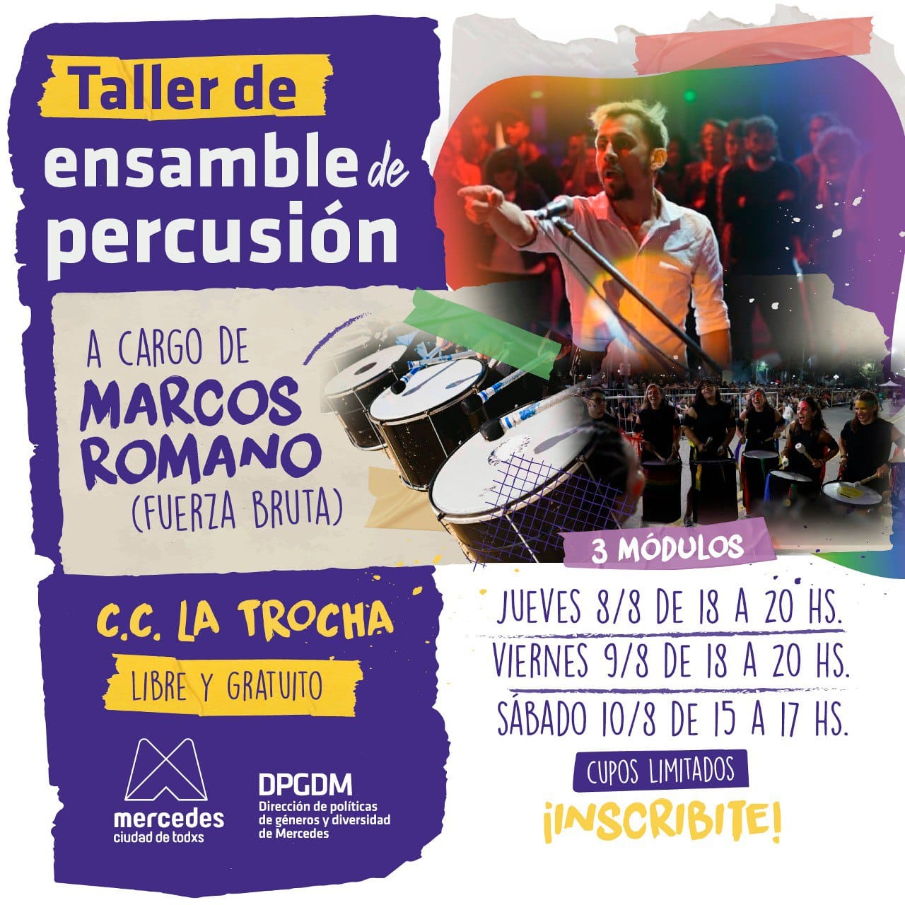 El reconocido percusionista Marcos Romano, de Fuerza Bruta, estará en Mercedes brindando talleres los próximos 8, 9 y 10 de agosto a través de las acciones generadas desde la Dirección de Políticas de Géneros y Diversidad.